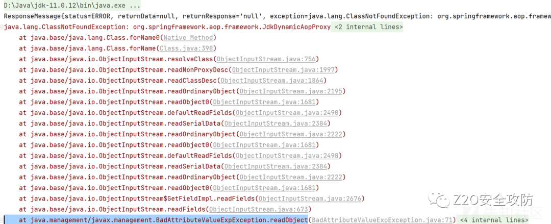 发现客户端里有这个类。于是对响应的对象进行readObject还原,然后取出里面的Exception对象,打印stackTrace。