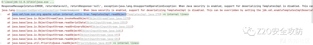java.lang.UnsupportedOperationException: When Java security is enabled, support for deserializing TemplatesImpl is disabled. This can be overridden by setting the jdk.xml.enableTemplatesImplDeserialization system property to true.