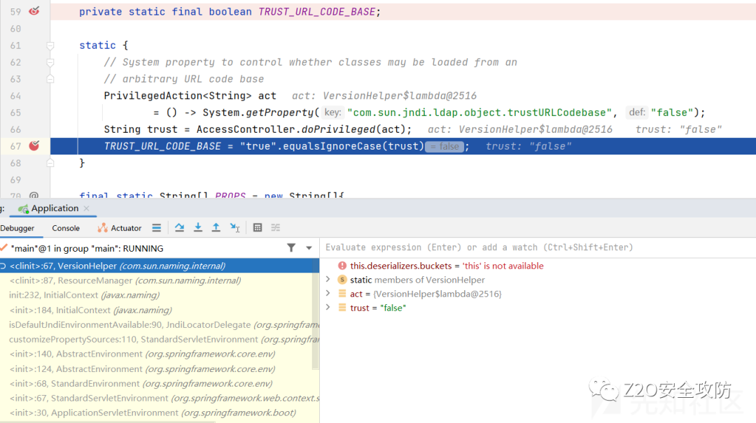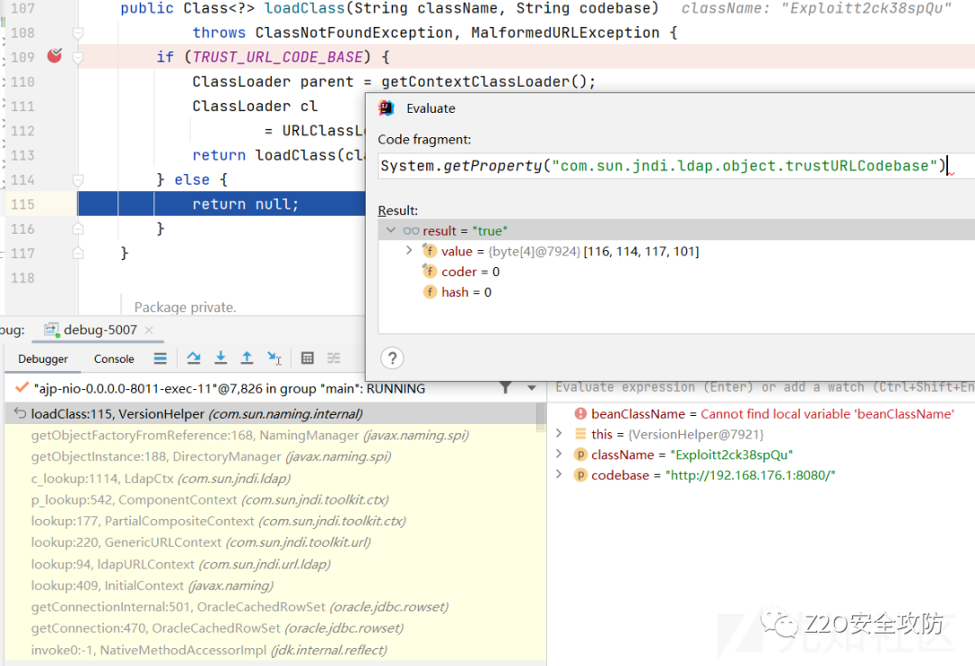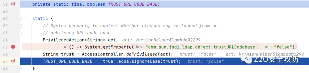 值,只有为true的时候,才能从远程URL拉取class。而这个值在这个类第一次被加载的时候,就会根据当时的系统属性com.sun.jndi.ldap.object.trustURLCodebase
