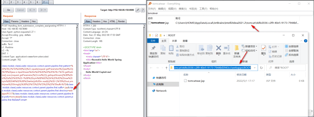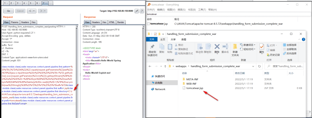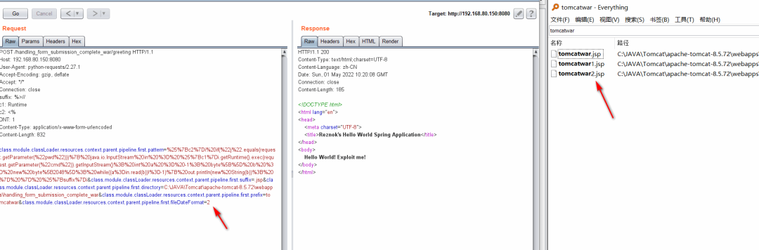注意:这里webapps/ROOT是写入相对路径,C:\JAVA\Tomcat\apache-tomcat-8.5.72\webapps\handling_form_submission_complete_war是写入相对路径;同时,路径只能写入1次,无法修改,所以验证漏洞存在,写入webshell时,需要知道网站的相对路径,或者绝对路径,才可以写入成功。因此,对于linux环境,漏洞利用,可以写入ssh密钥,或者定时任务,比写入webshell更有价值;
