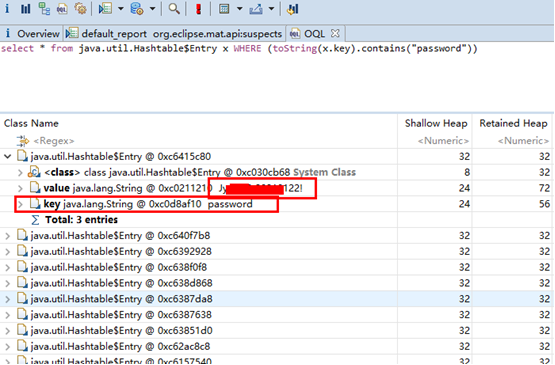 可利用以下可用的oql代码在堆信息中找到明文密码(代码啥意思自行百度吧,我也百度了好几个小时各种尝试实验才完全弄明白…)select * from java.util.Hashtable$Entry x WHERE (toString(x.key).contains(“password”))