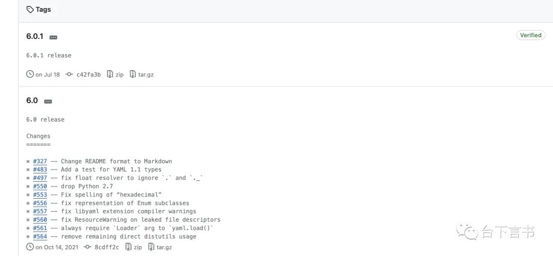 PyYAML目前github最新版本为6.0.1,推送于2023.7.18,而上一个版本6.0发布于2021.10.4,根据Changes可以发现在6.0版本强制要求用户自己定义Loader加载器,不存在默认加载器了。