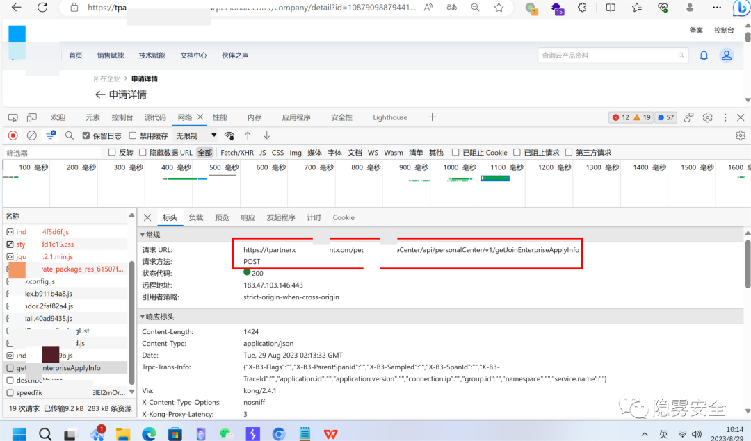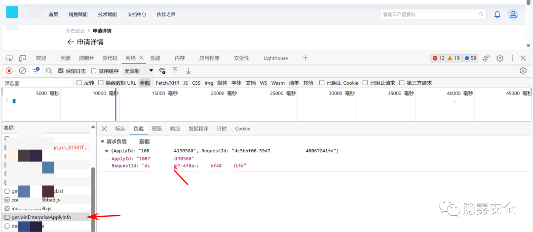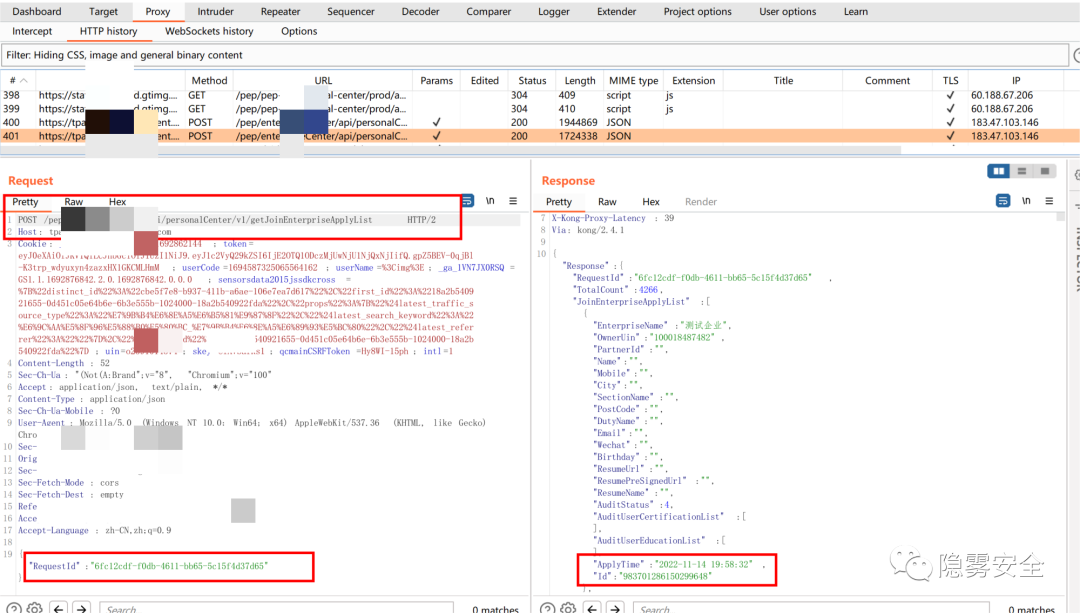2. 使用burp工具抓取请求数据包,发现有请求列表的数据包,可以获取申请列表信息