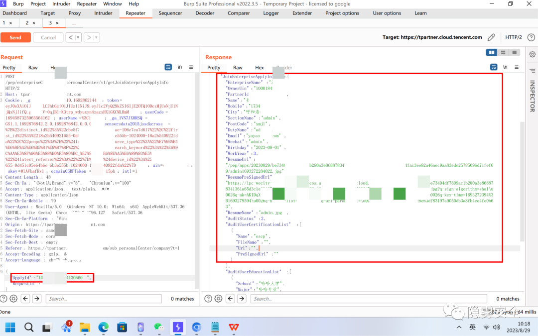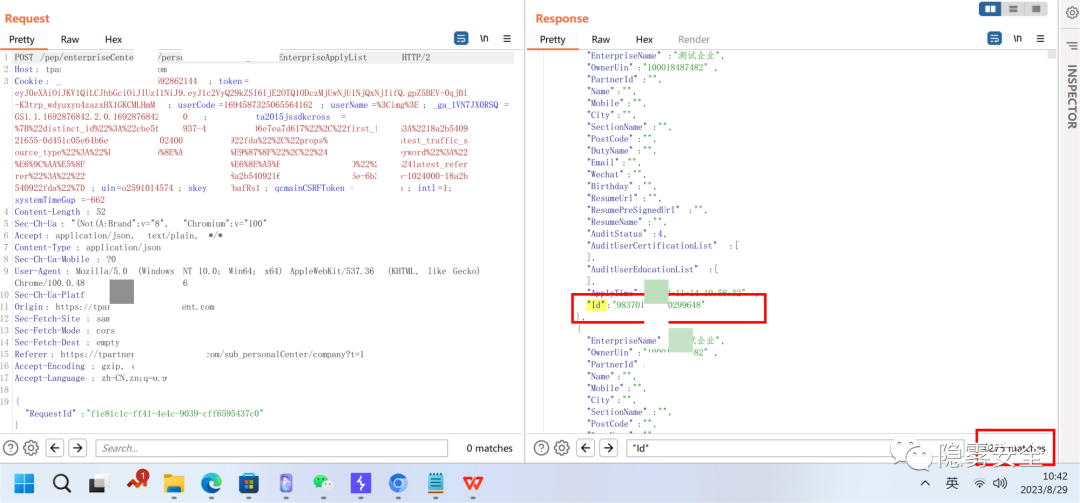 6. 尝试替换请求包中的ApplyId,可以用步骤2中的返回包里的Id值进行替换