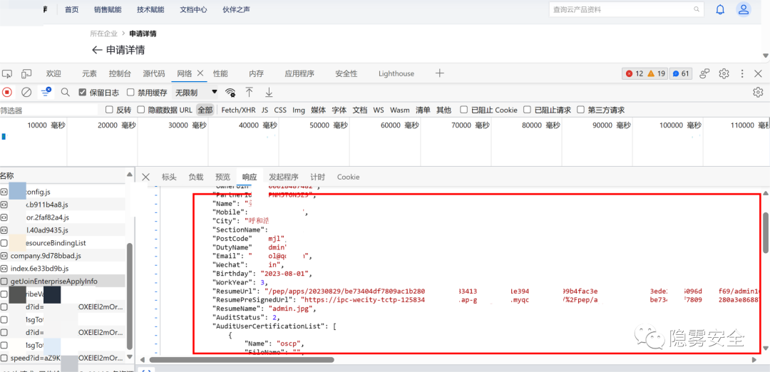 - 用浏览器抓取查看详情数据包。发现铭文的铭感数据,真实姓名,联系方式,简历链接等