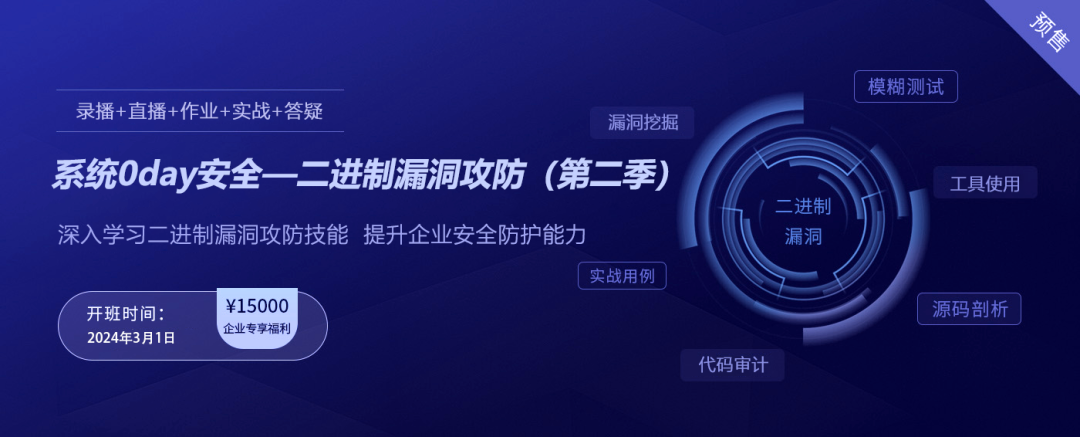 早鸟价限时75折!系统0day安全-二进制漏洞攻防(第二季)火热开课啦