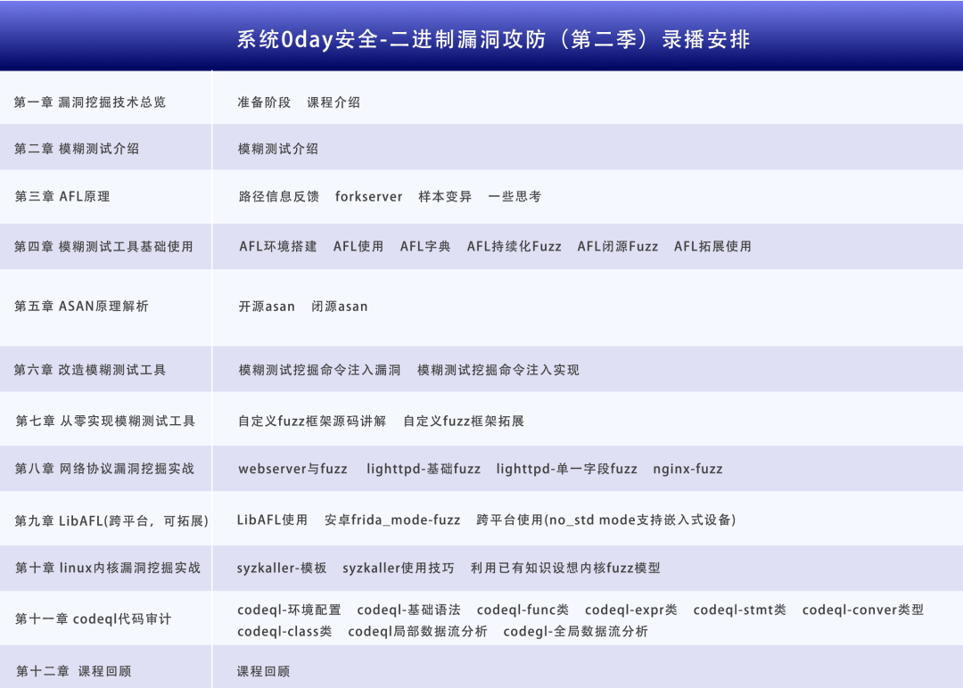 包括模糊测试、AFL原理、ASAN原理、网络协议漏洞挖掘、Linux内核漏洞挖掘、AOSP漏洞挖掘以及CodeQL代码审计等,为学员提供了全面的学习资源。