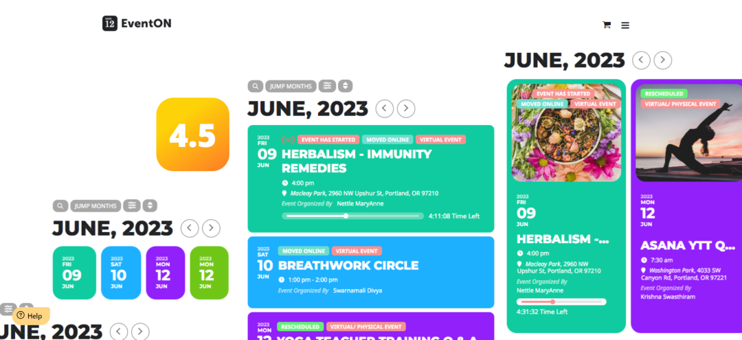 EventON是一个活动日历插件,以最小的整洁设计呈现活动。它包含200多个有用的功能,例如高度可定制的重复事件、多个事件图像、无限的事件创建、各种日历布局设计、事件地点和组织者,以及多数据类型和语言对应事件等高级功能。