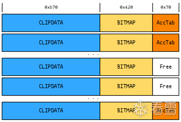 此时编译运行,在分配内存处下断点可以看到漏洞函数申请的内存刚好在剪切板数据和BitMap对象后,且这三个数据加一起共占一个页的大小。而下一个页的数据是剪切板数据,BitMap对象和加速表对象,所以此时的内存布局已经如上图所示。同时,也记录下下一内存页的BitMap对象的数据,以供之后比对。