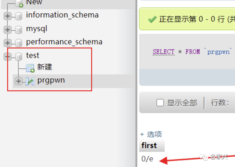 成功执行命令,并且在test数据库下创建了一个名为prgpwn的表