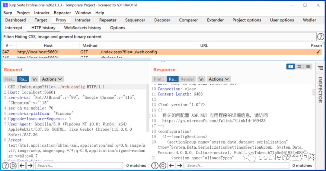 上述代码读取文件创建一个FileStream 文件流,从文件流中读取文件内容并将存储在字节数组 bytes中。最后通过Response.BinaryWrite(bytes) 将文件的字节数组内容写入 HTTP 响应流发送到客户端。提交file参数 “../web.config”,成功读取敏感文件内容。如下图