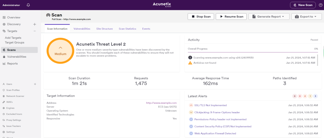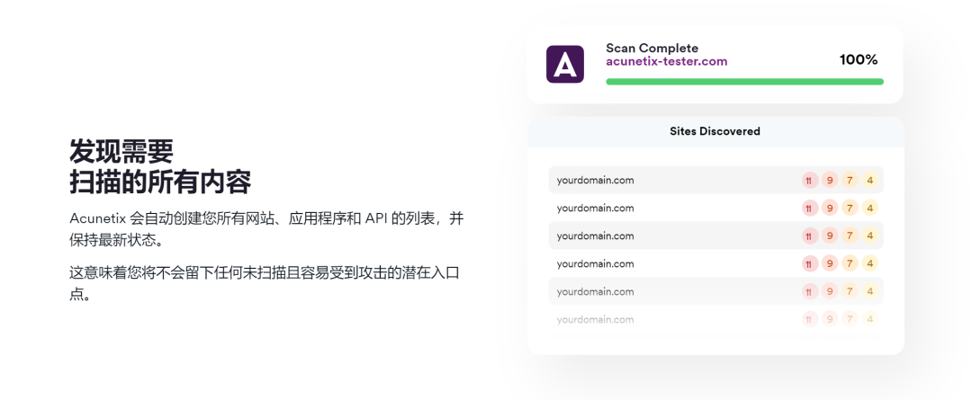 的主要功能之一是能够自动扫描 Web 应用程序是否存在安全漏洞。自动扫描过程结合使用 Web 应用程序扫描技术(包括深度数据包检查和指纹识别)来识别潜在漏洞并提供有关每个风险的详细信息。Acunetix Premium