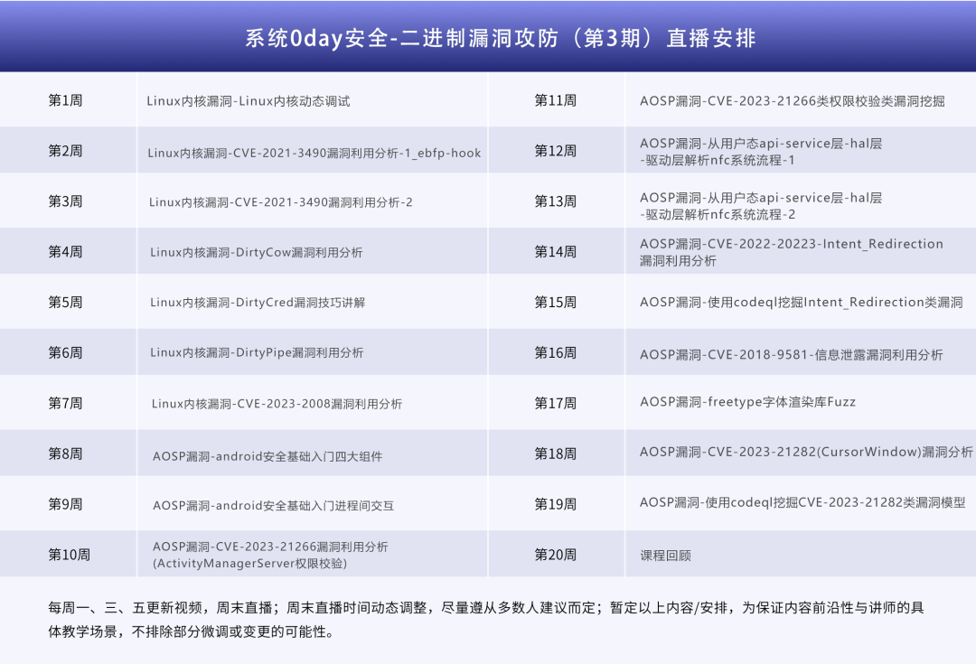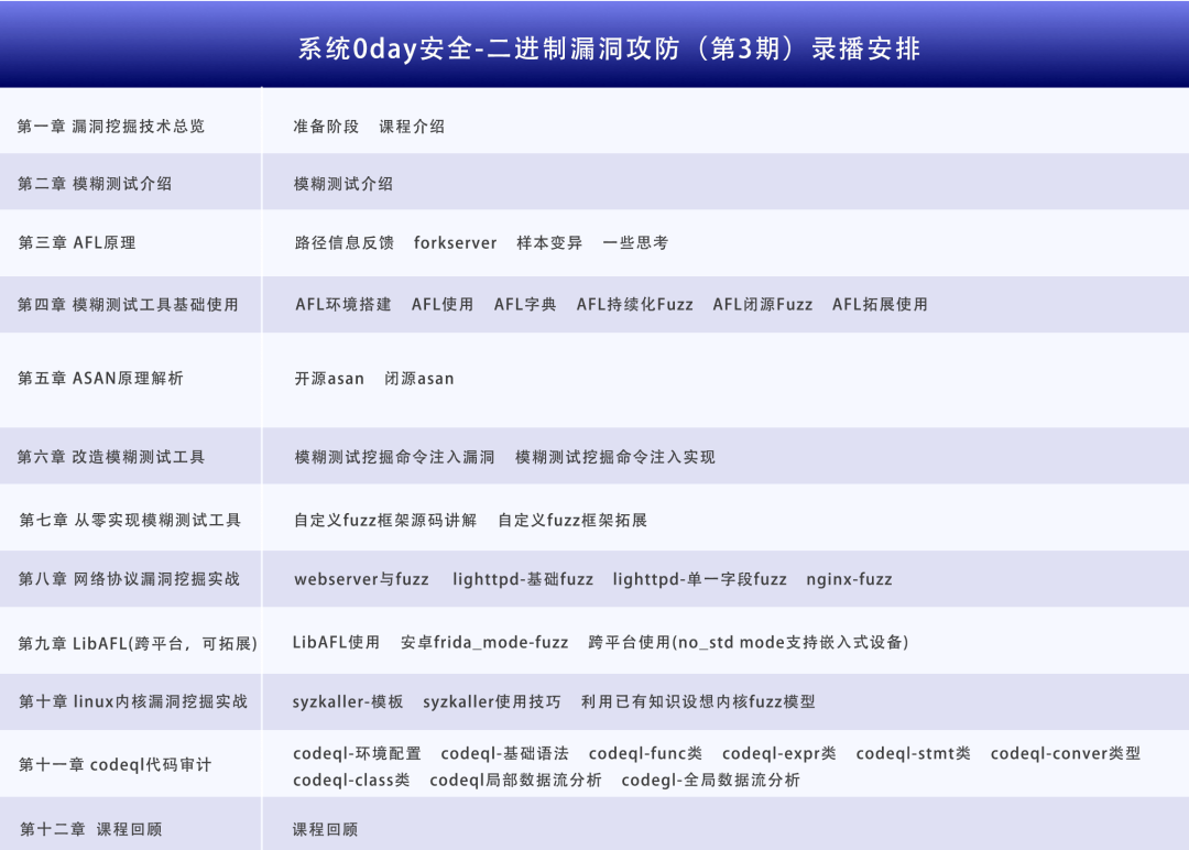 包括模糊测试、AFL原理、ASAN原理、网络协议漏洞挖掘、Linux内核漏洞挖掘、AOSP漏洞挖掘以及CodeQL代码审计等,为学员提供了全面的学习资源。