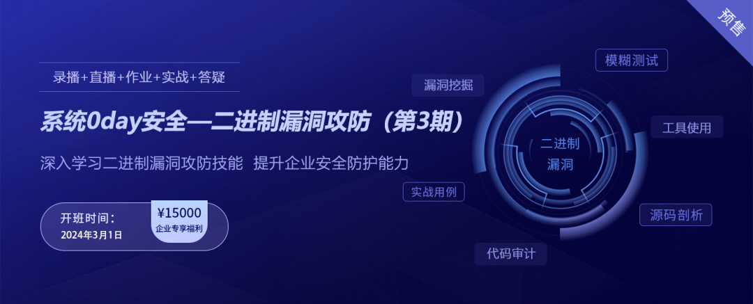 3月1日开班!系统0day安全-二进制漏洞攻防(第3期)