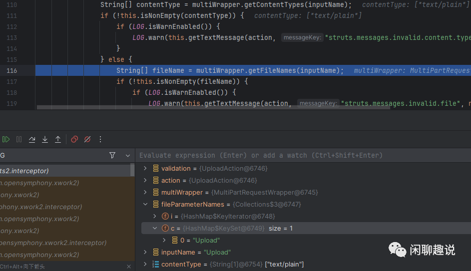 在调试器中可以看到inputName为表单中name参数对应的值,struts会尝试根据inputName获取content type和fileName。