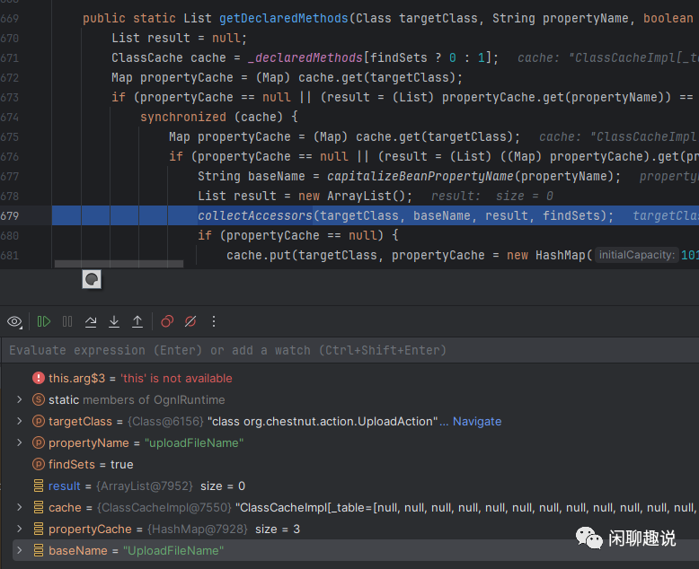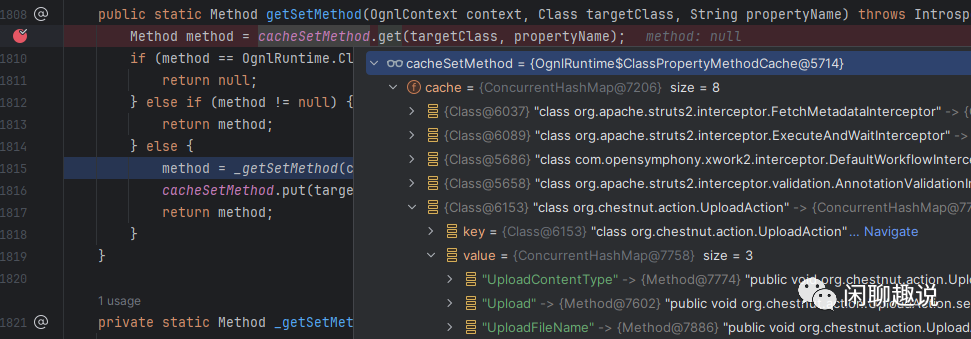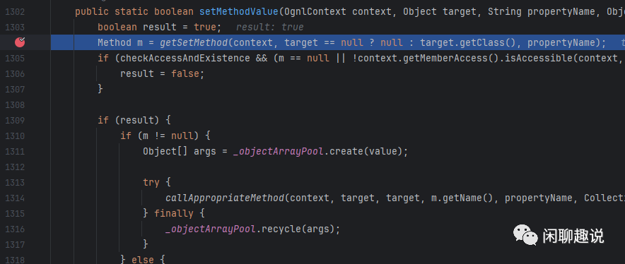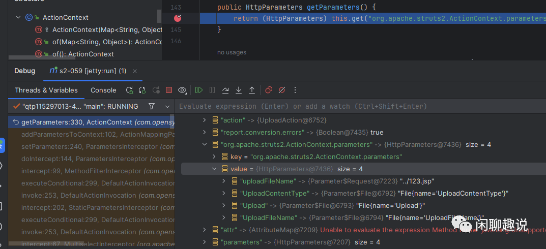 获取到参数之后需要将参数通过Action的setter方法绑定到Action中的变量上。在定义的action中的set方法断点,重新调试,发送恶意请求,调试器中主要调用栈如下: