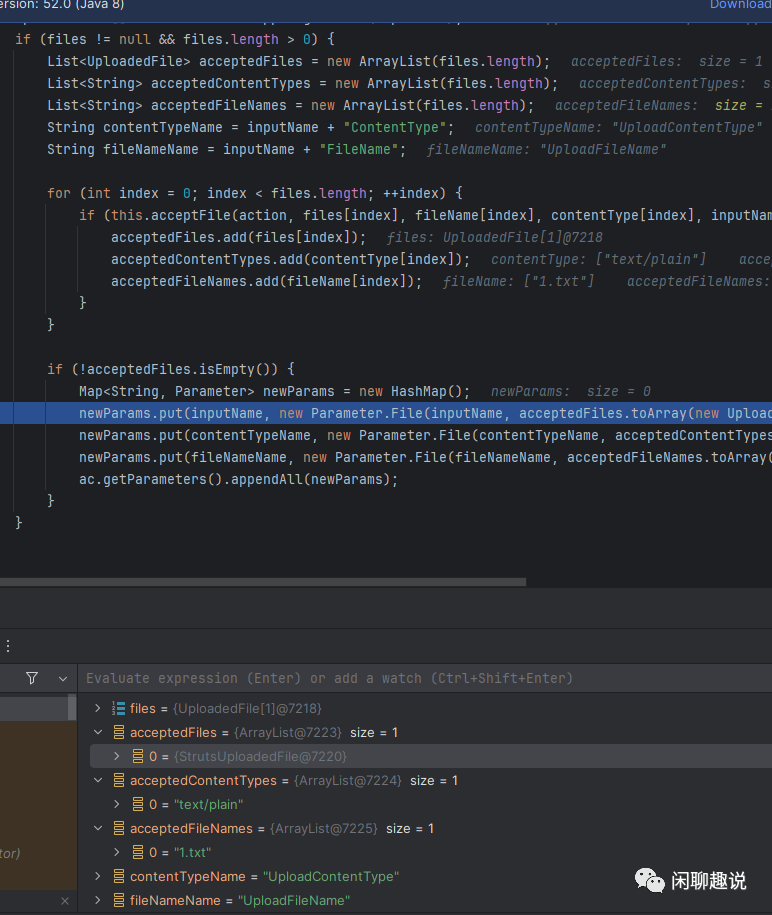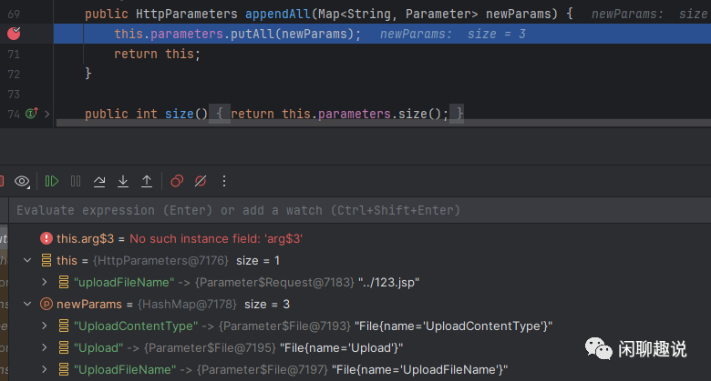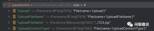 回到intercept方法中,在后面会拼接inputName组成contentTypeName和fileNameName作为Map的key,并将获取到的contentType和fileName作为value加入到HashMap中,而后通过appenAll方法将HashMap添加到HttpParameter