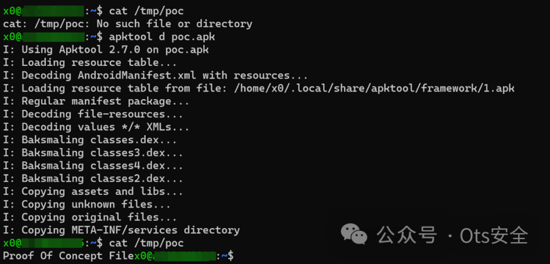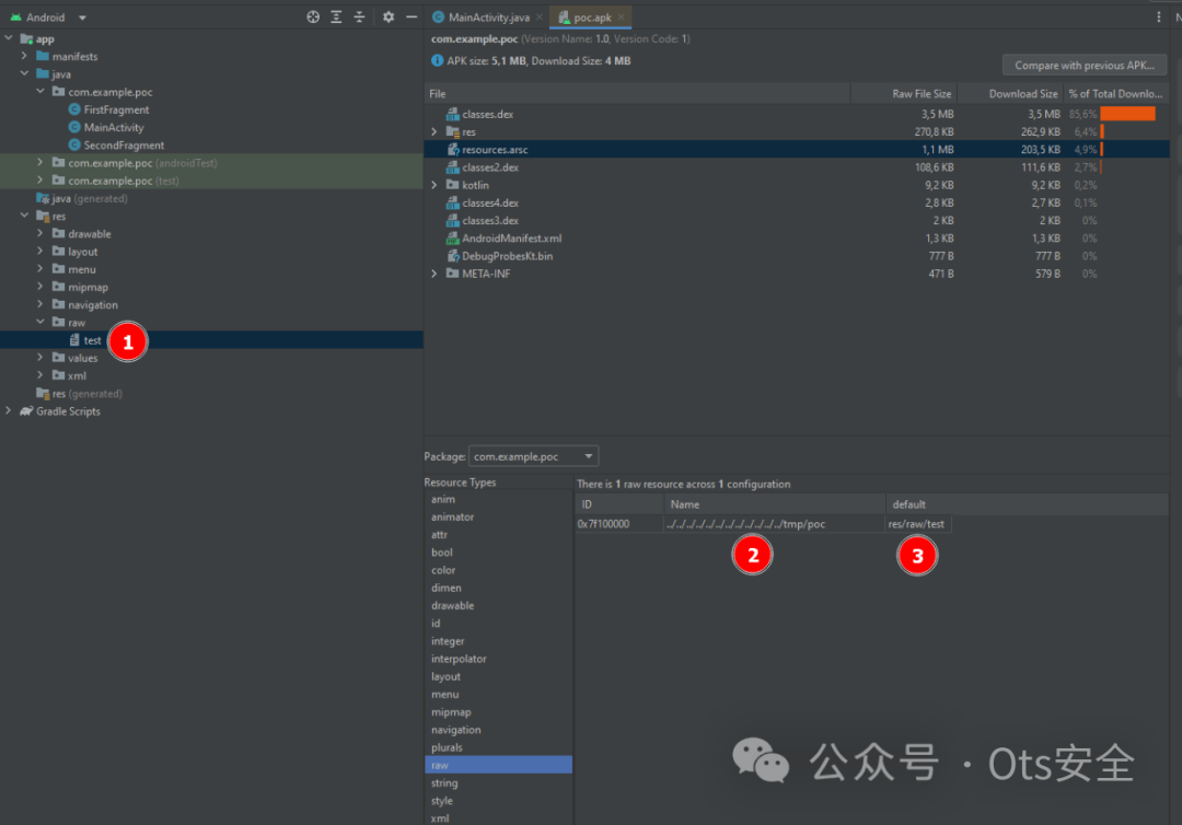 然而,如果资源名称被更改为可能导致路径遍历的字符串(例如“../../../../../../../../../../../../tmp/poc”),那么“res/raw/bar”文件就会被放置在 Linux 系统中的 /tmp/poc