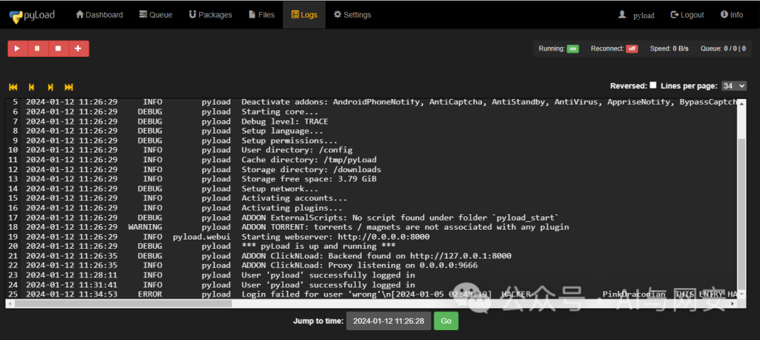 pyload尝试使用错误凭据登录时将生成日志条目。该条目将采用 的形式Login failed for user ‘USERNAME’。但是,当提供包含换行符的用户名时,该换行符不会正确转义。换行符也是日志条目之间的分隔符。这允许攻击者将新的日志条目注入日志文件中。