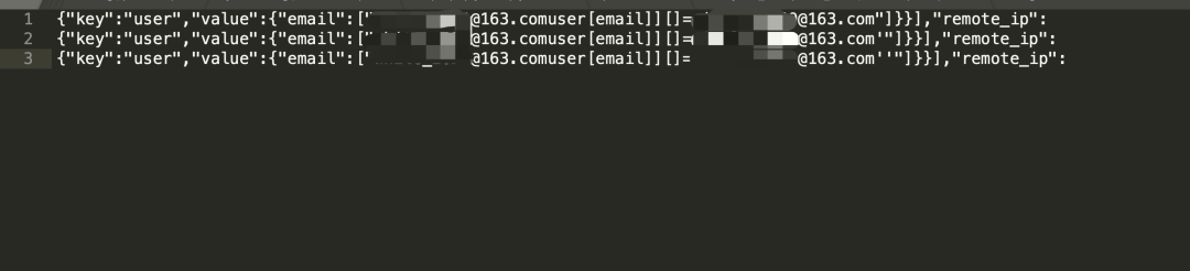 4.排查攻击的时候可以查看production_json.log日志文件,使用{“key”:”user”,”value”:{“email”(.*?)}}],”remote_ip”:正则匹配到的邮箱,重点排查非Gitlab中注册用户的邮箱