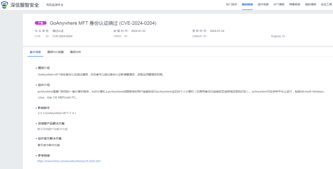 2024年1月24日,深瞳漏洞实验室监测到一则GoAnywhere MFT存在身份认证绕过漏洞的信息,漏洞编号:CVE-2024-0204,漏洞威胁等级:严重。
