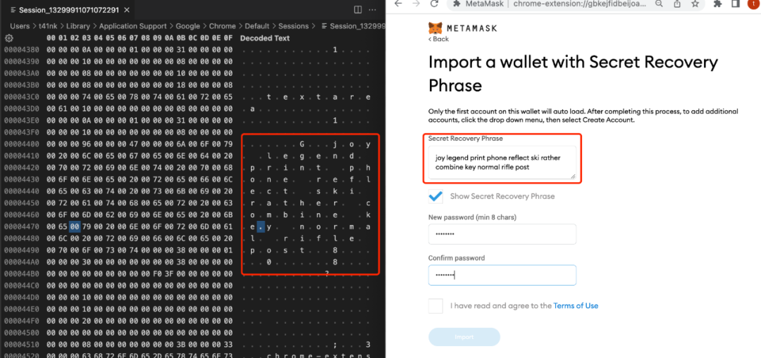 然后继续解决问题 2:Sessions 目录会记录 Tabs 的缓存,为了找出缓存被记录的时间节点,我对导入助记词的整个流程进行了分解,然后在每一步操作之后去观察 Sessions 的数据变化。发现在如下这个页面输入助记词数据后,需要等待 10 – 20s,然后关闭浏览器,明文的助记词信息
