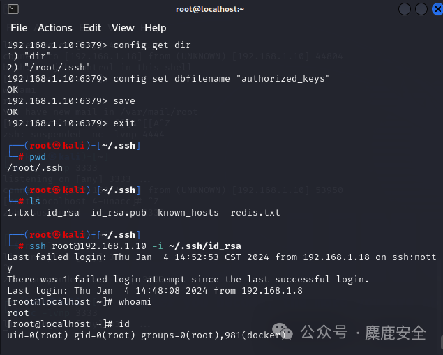 攻击者在未授权访问Redis的情况下,利用Redis自身的提供的config命令,可以进行写文件操作,攻击者还可以成功将自己的ssh公钥写入目标服务器的/root/.ssh文件的authotrized_keys 文件中,进而可以使用对应私钥直接使用ssh服务器登录目标服务器。