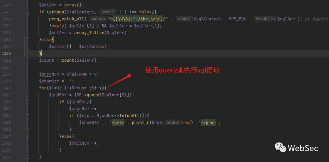 的数组。可以发现可以使用query来执行sql语句,复现时构造恶意的SQL语句即可。