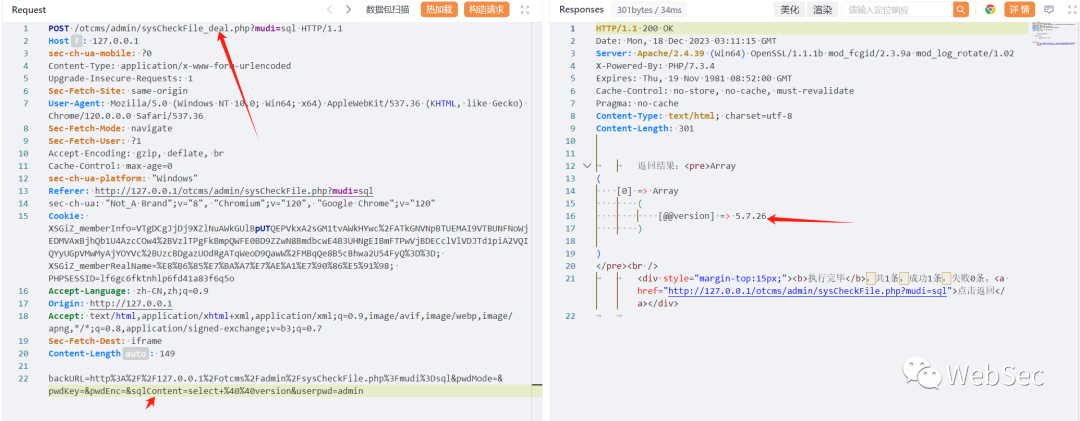 抓包看看路由怎么走,可以看到是sysCheckFile_deal.php文件,执行SQL语句的参数为sqlContent