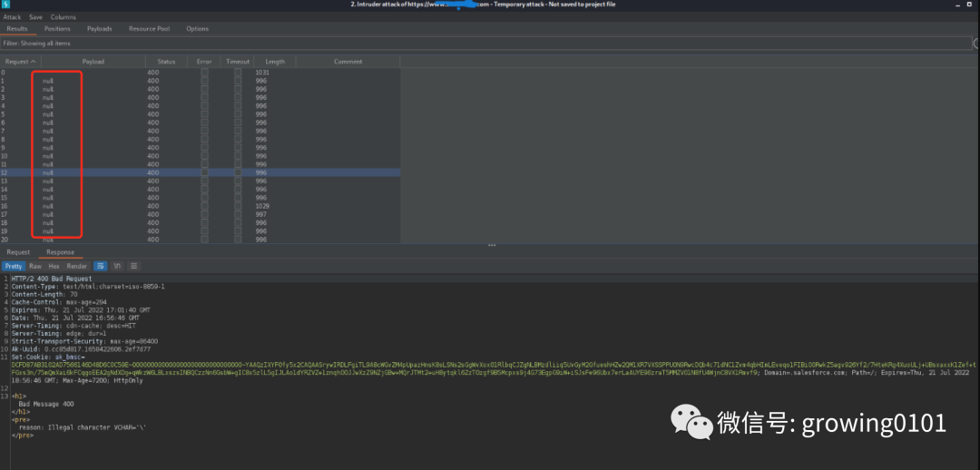 对于这个漏洞,Akamai有一个解决方案,通过让400响应在缓存中只持续5秒,然而,攻击者可以在burp中使用intruder模块发送null有效负载,这样相同的400响应就永远被缓存了