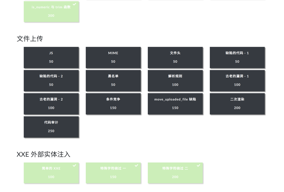 目前靶场一共有 13 题,感觉基本上的上传姿势点都覆盖了,除了 Windows 下的 点、空格、::$DATA 特性没有覆盖到,其他的感(这个偷懒理由针不戳!)
