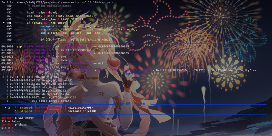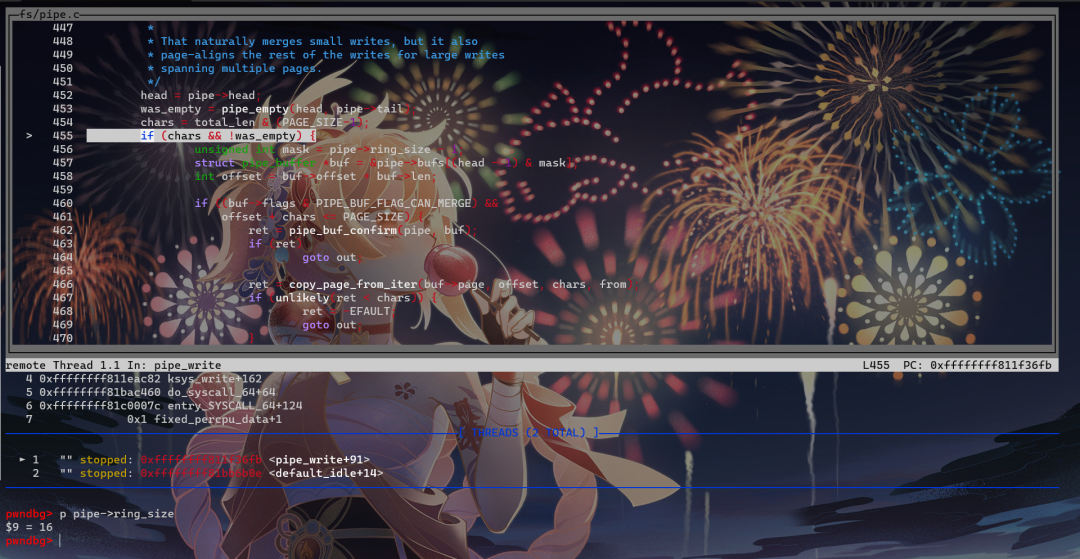 前面写的 EXP 虽然能成功,但是还不够完善,因为经过调试之后,发现set_can_merge这里不需要遍历整个 pipe 缓冲区,正如前面分析的,如果管道为空或者读取字节为PAGE_SIZE整数倍,那么都直接复制页,不选择续写,所以我们连着读写 16 次就可以给所有的缓冲区打上PIPE_BUF_FLAG_CAN_MERGE标志。