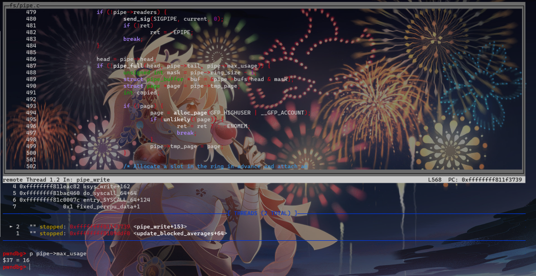 首先判断 reader 是否有效。随后判管道是否慢,不满则向下执行,其实判满的条件仅仅是head-pipe->tail>=pipe->max_usage。其实这里的max_usage大概率也是常量 16,验证一下,果然如此。