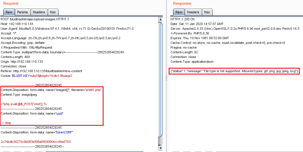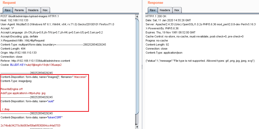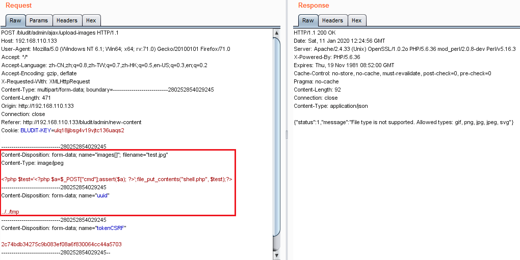 它把用户上传的文件移动到了Bludit的tmp文件夹中(具体路径是/bludit/bl-content/tmp)。此时恶意文件已经存在于tmp文件夹中,接着再调用transformImage函数,然而transformImage虽然对文件后缀名做了检测,但是没有删除不合规文件,因此通过Burpsuite代理上传php文件可以成功。