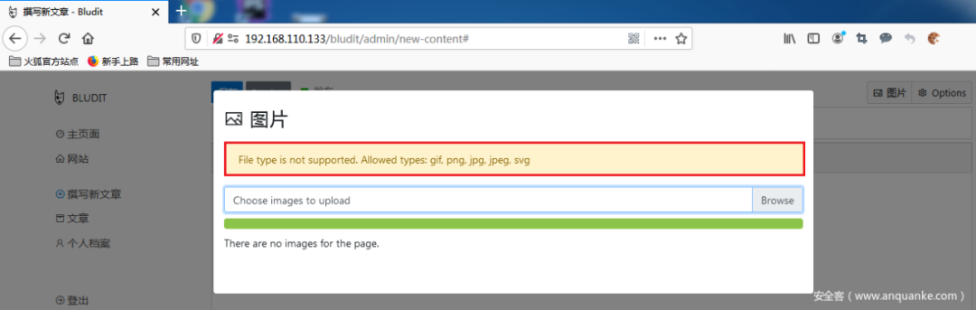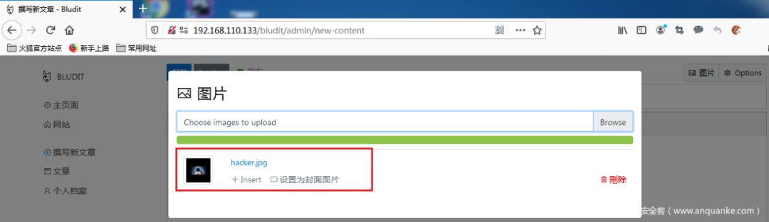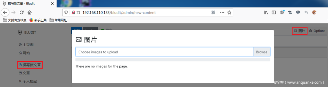 2.利用test/test123登录Bludit,打开“撰写新文章”栏目,点击“图片”按钮,进行图片的上传: