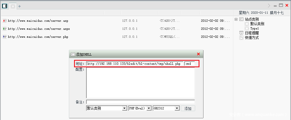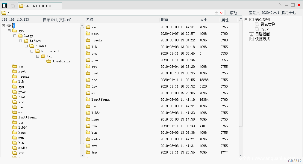 6.使用中国菜刀连接后门文件shell.php,成功连接到Bludit服务器,可以利用菜刀对服务器文件进行新建、修改、上传以及删除等等操作,如下图所示: