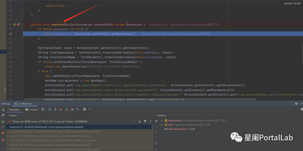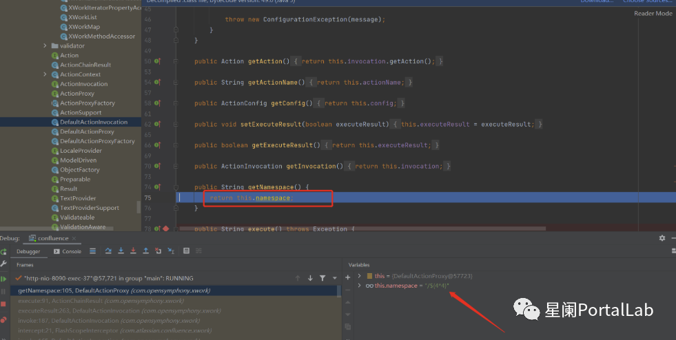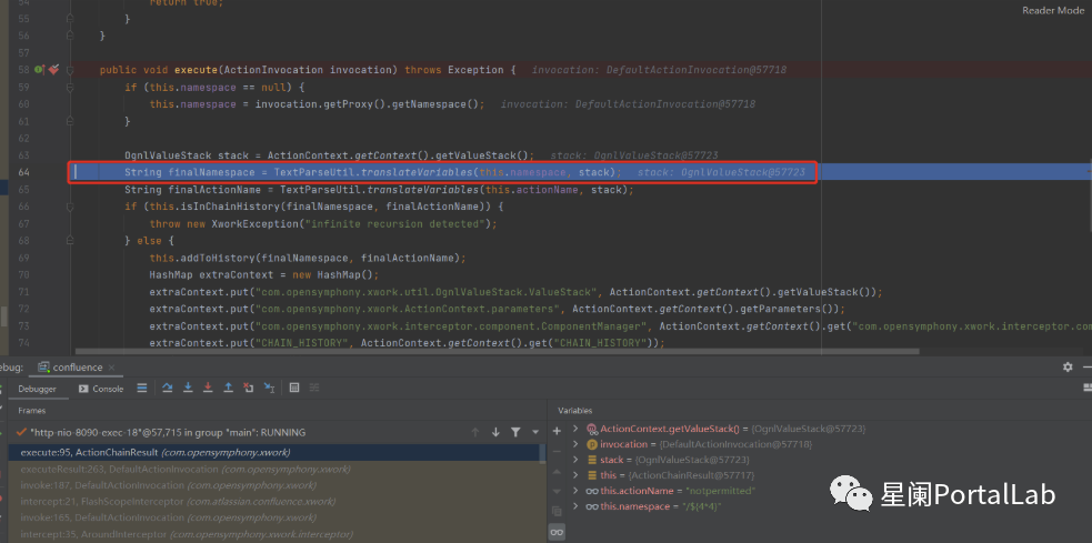 继续跟进,在com.opensymphony.xwork.ActionChainResult中,会调用translateVariables函数对OGNL表达式进行解析,表达式的值为namespace的取值。