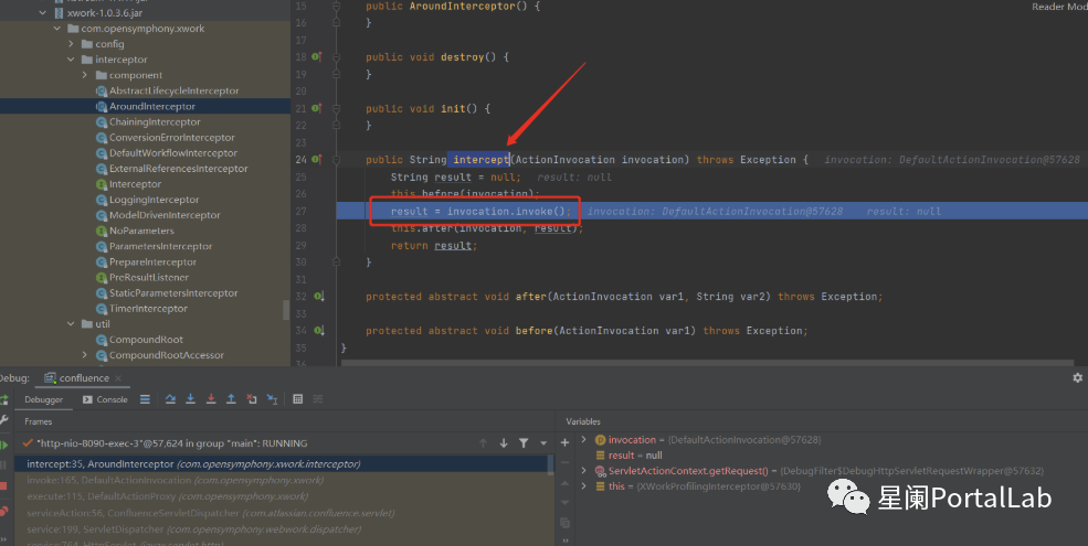 继续跟进来到com.opensymphony.xwork.interceptor.Aroundlnterceptor#intercept,发现invoke函数通过调用intercept方法,形成迭代循环。