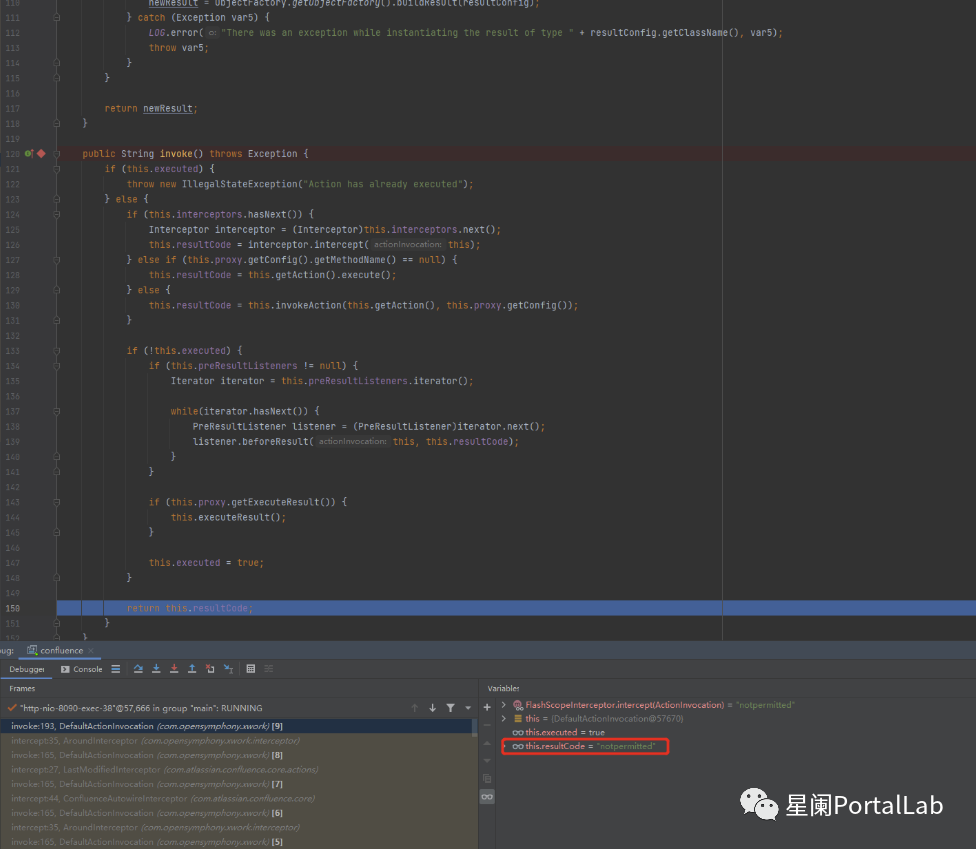 通过不断调试,发现在满足一定条件之后,将不会继续调用invoke函数,而是将返回 notpermitted  并赋值给 resultCode,跳出循环。
