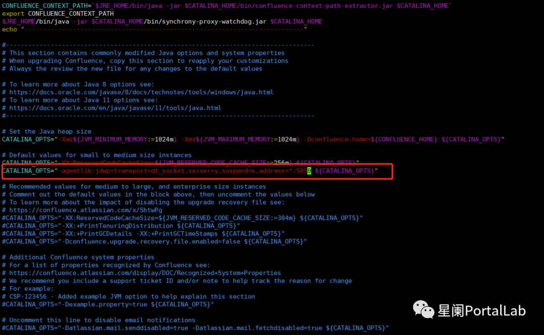 在容器中/opt/atlassian/confluence/bin目录下修改setenv.sh文件,加入远程调试配置。