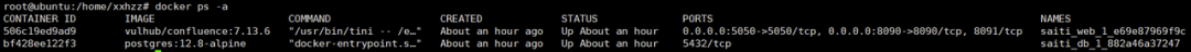 使用命令docker-compose up -d成功启动环境后,查看容器id等相关信息(5050为远程调试端口)。