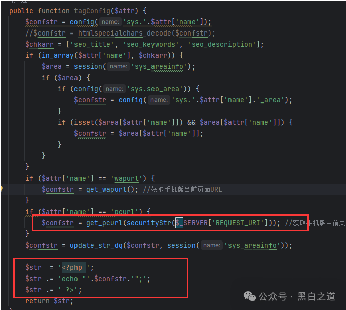 由于在这些处理标签的方法中,会对标签的类型进行判断,并将对应的内容转换成php代码,所以我们寻找漏洞的思路就是查看这个方法中是否有可控参数或可控方法从而造成php代码执行。
