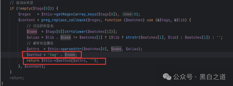 在parseTag方法中,分别对闭合标签和自闭合标签进行处理和替换对应的php代码