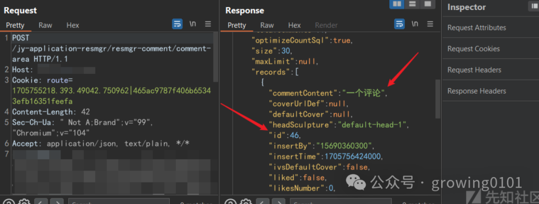 - 为了方便测试,此时我们到个人中心里面查看已发表的评论,抓包观察这个评论的id是46。
